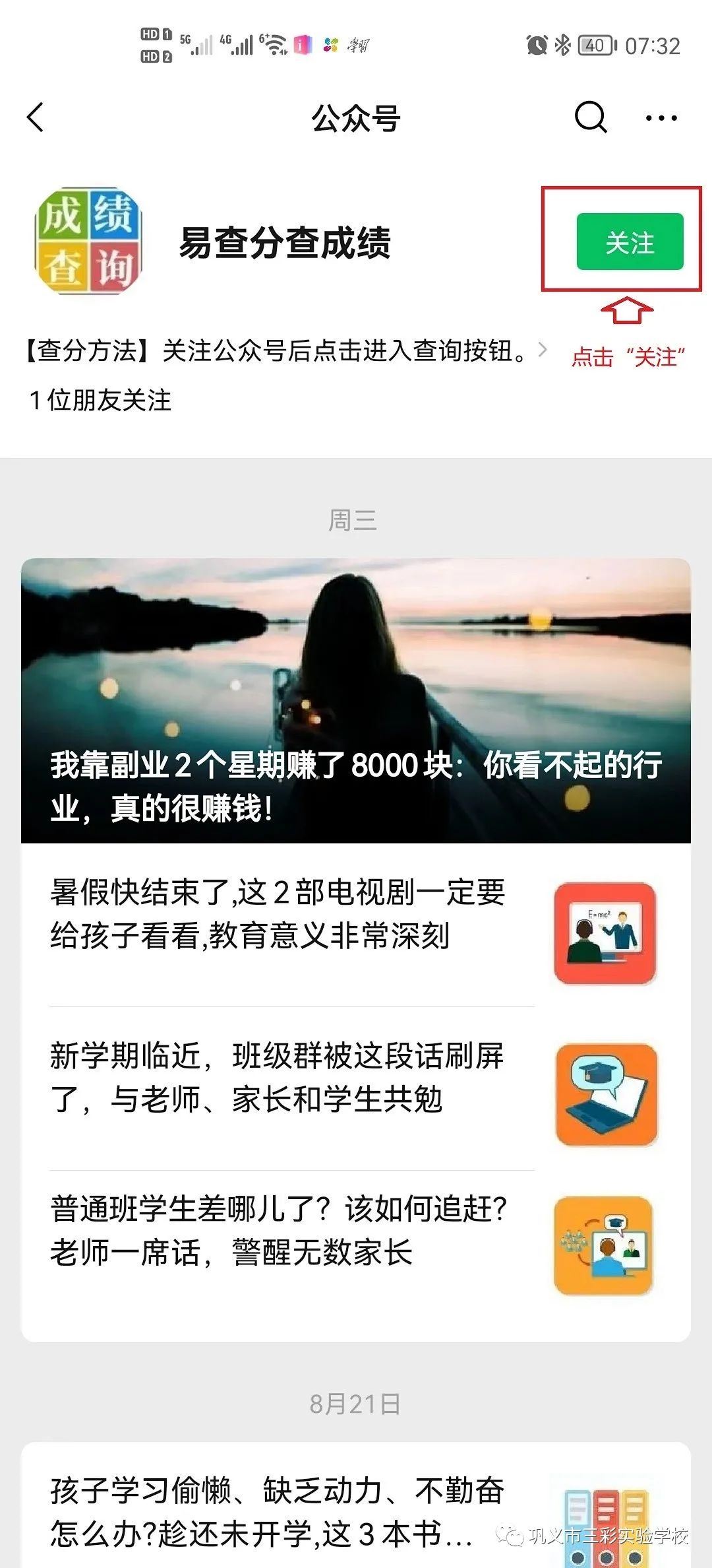 1.扫描上面二维码,关注“易查分查分数”官微
