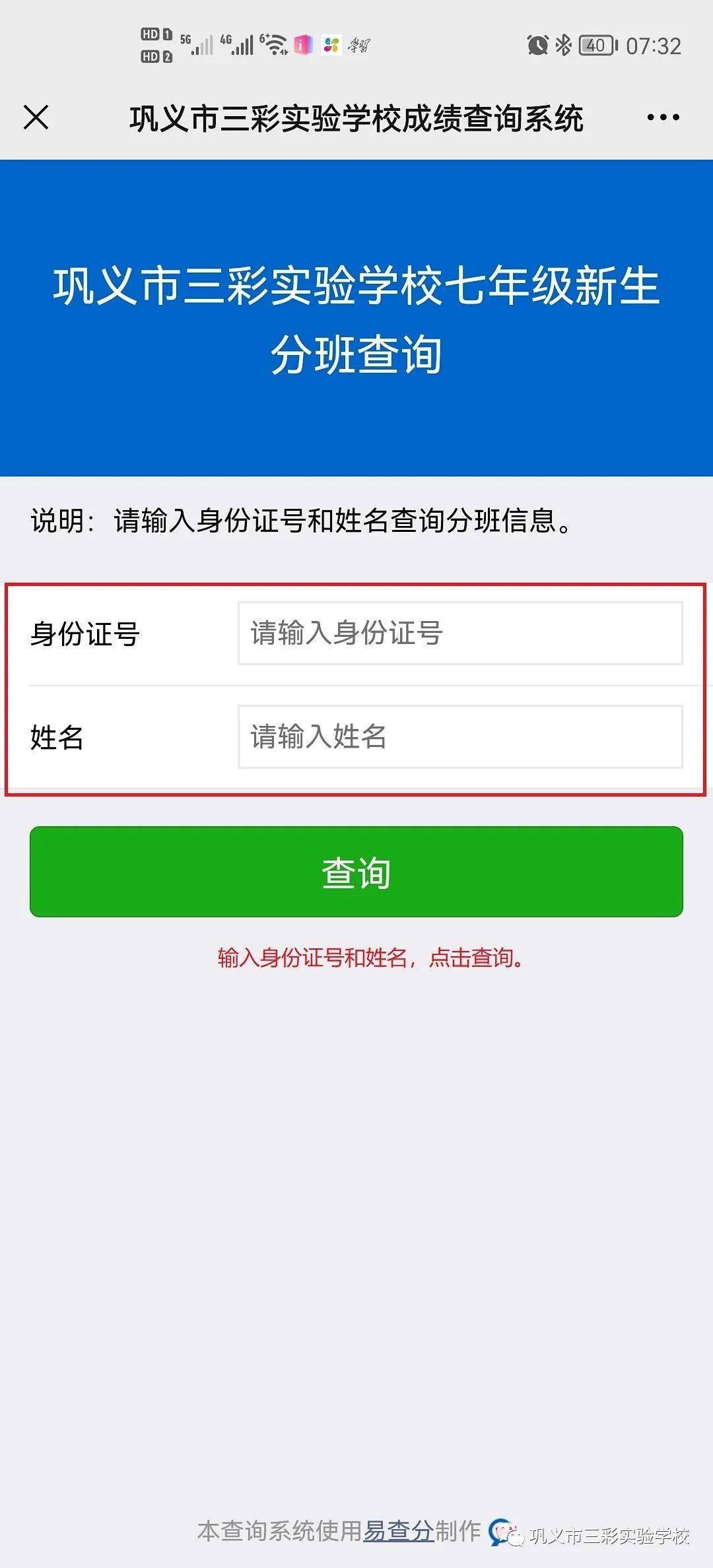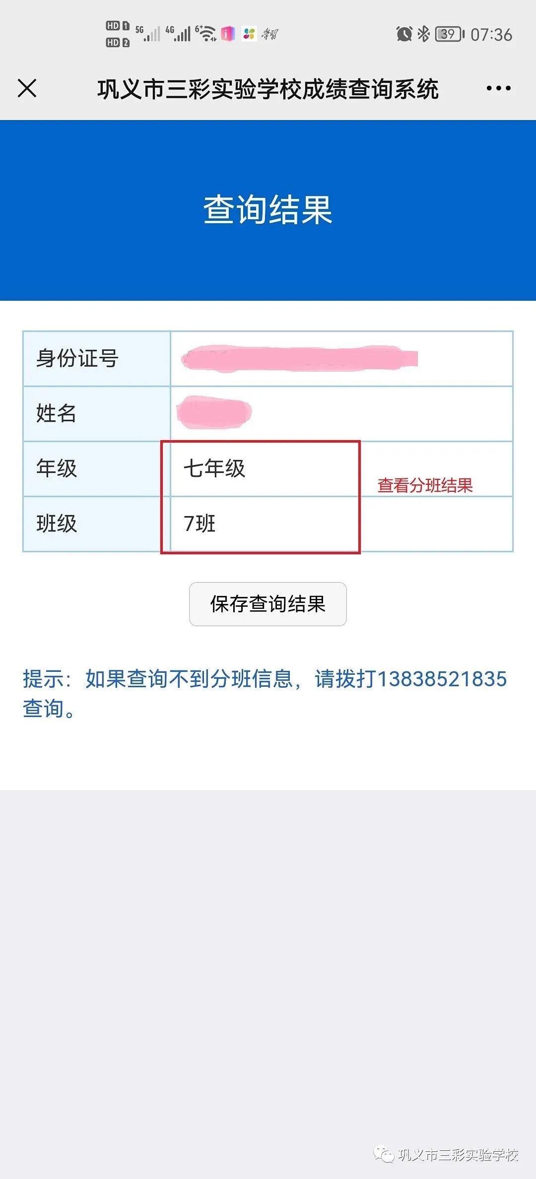 5.点击“七年级新生分班查询”。