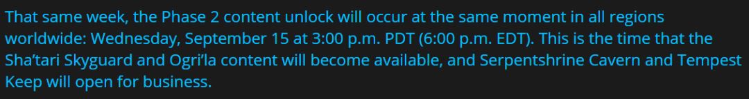 北京时间9月16日(周四)早上6点解锁TBC怀旧服阶段全部内容,第二阶段的内容将在全球范围内解锁,时间是太平洋时间9月15日星期三的下午3:00(也就是北京时间的9阿努巴尔的束缚月16日早上6:00)。届时沙塔尔和奥格瑞拉声望将开放,毒蛇神殿和风暴要塞也将同时开启!分别有6个和4个BOSS,这10个BOSS掉落的装备在128~138之间,装备质量相比T4有大幅的提升,除了装备质量有提升,在P2开放之后T4套件掉落也将会翻倍,玩家们毕业的速度也将大大加快。