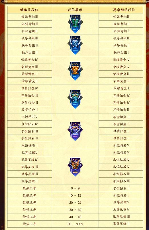 通过段位继承表可以看出来,只要大家在王者20星就可以在钻石段位以上了,如果在王者19星以瑞尔动物庄园下,那么就要继承在钻石段位,目前距新赛季开启还有一个月的视觉,大家还是可以努力上分的,希望可以达到一个比较好的实力吧。