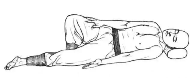 【练法】头向左卧,左腿伸,右腿屈立;左手仰放床面,右手覆按右腿上;坦腹,虽侧身但稍向上。