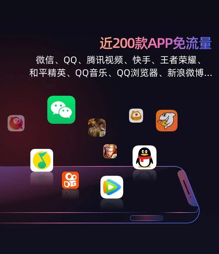 二、近200款应用流量全免:腾讯旗下所有应用(QQ、微信、腾讯视频、QQ音乐、王者荣耀、和平精英、QQ浏览器、微视、腾讯地图....),全国免流量,国内流量1元=1G。