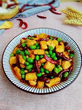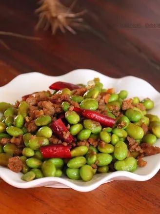 6.加入焯过水的毛豆继续翻炒,出锅前撒少许盐即可