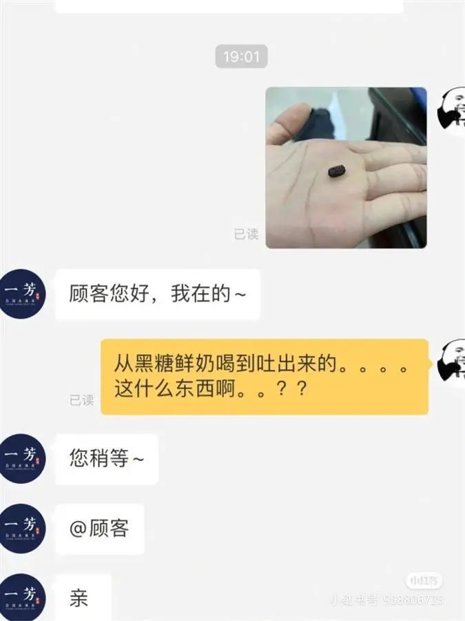 30日凌晨2时34分,该网友第三次发布图片,是其与头像显示为“一芳台湾水果茶”店方的对话截图,截图显示8月29日下午7时许,该网友将图片发给店方问询从黑糖鲜奶中喝出的黑色异物是什么东西,店方回复称问过店里制作饮料的工作人员,工作人员也不清楚这是什么,并称为该网友退款,或者补送饮料,晚点回店查清楚。