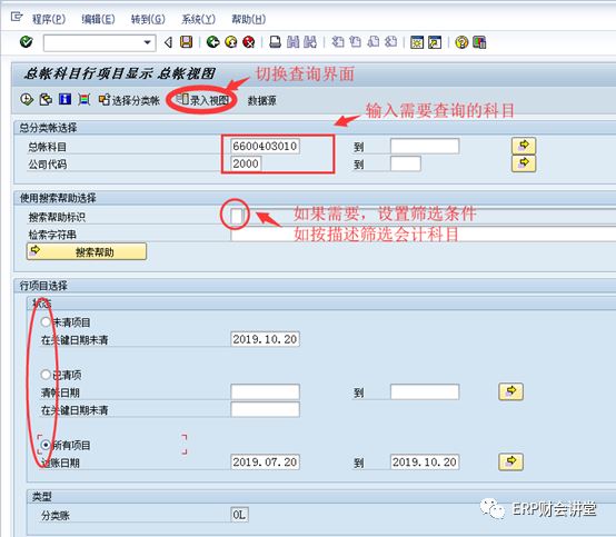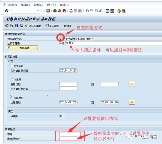 未清项目:对于启用未清项管理的科目,当清账之后系统会自动打上标记。如果只看处于未清状态的行项目,可以设置此选项,并且可以查看到某一天处于未清状态的行项目。例如,某一行项目在2019年8月21日被清账,那在8月20日它处于未清状态,在“在关键日期未清”处输入2019.08.20查询数据时就包含此凭证,如果输入2019.09.21查询就不包含此凭证。已清项目:查看处于已经清账状态的行项目,可以按清账日期查询。所有项目:未清和已清的行项目一起查询,即按日期区间按查询所有的凭证行。在查询科目明细时,一般需要知道科目编号,或者是输入“660403*”进行模糊查询,如果不知道科目编号,可以通过下面的“搜索帮助”选择科目。