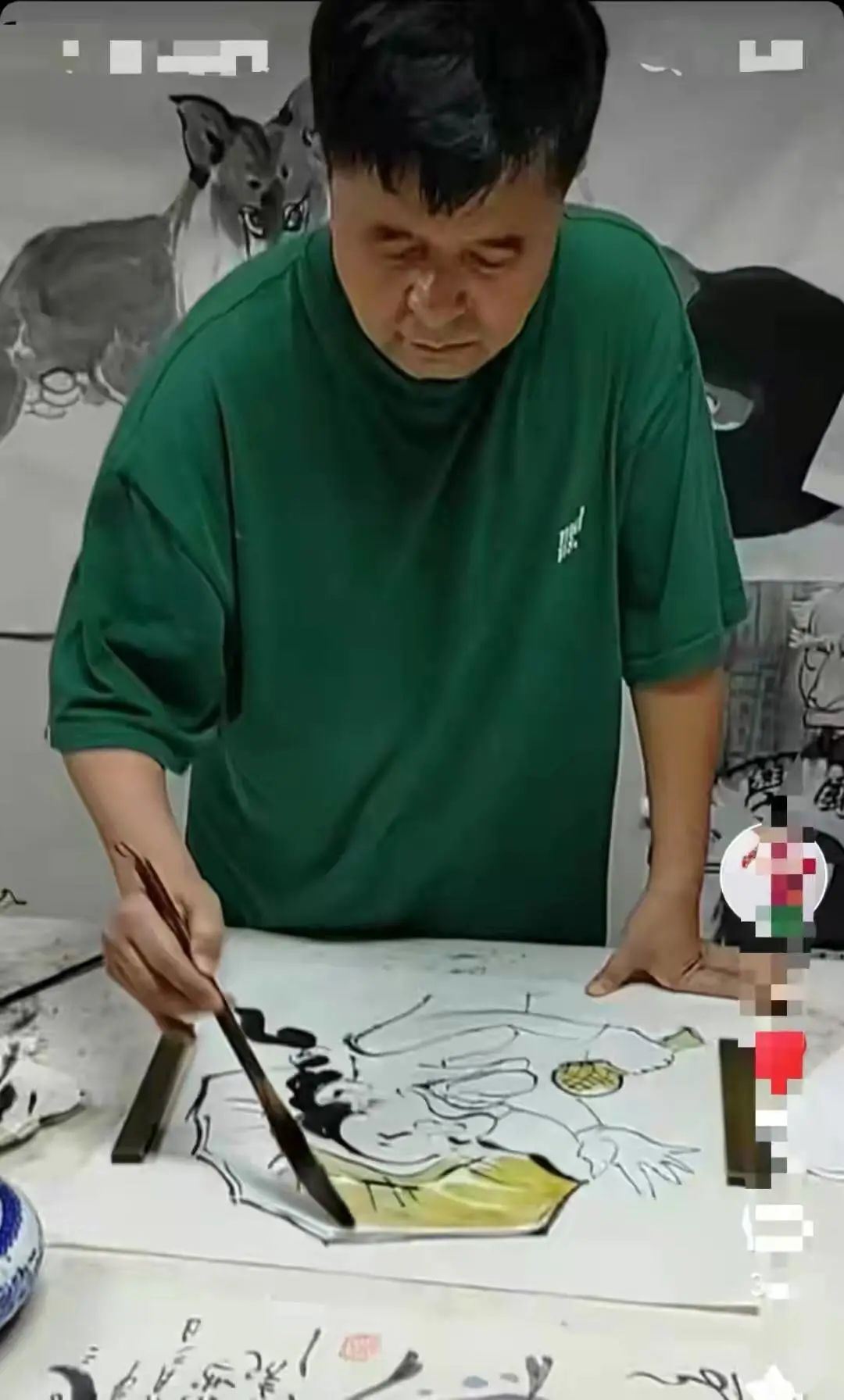 他认真地拿着毛笔为草帽姐的动画形象着色,显得非常专业。