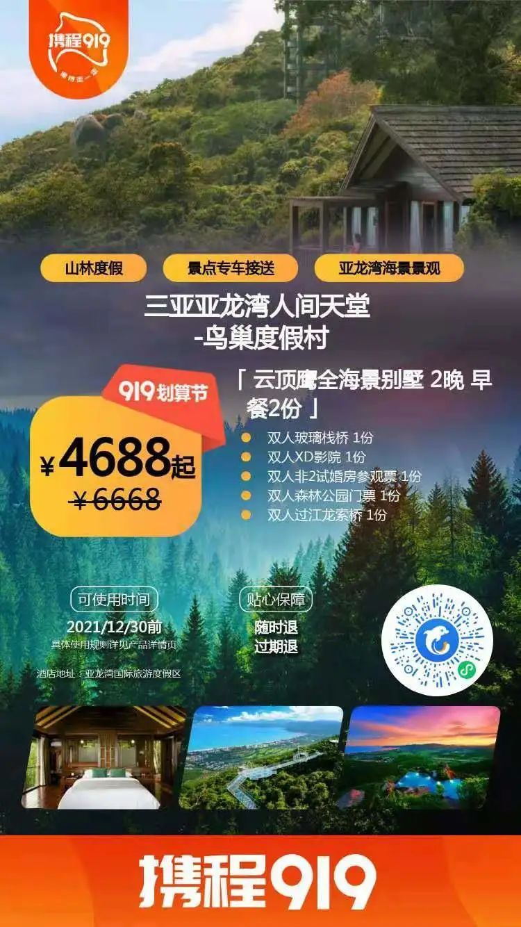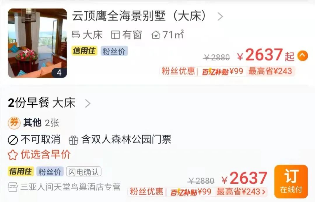 以三亚亚龙湾人间天堂-鸟巢度假村为例,云顶鹰全海景别墅2晚的价格,在去哪儿网查到的最低价是3787打折2=7574。