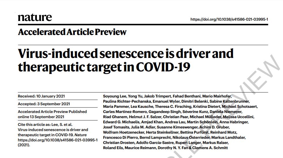 [1] Lee, S., Yu, Y., Trimpert, J. et al. Virus-induced senescence is driver and therapeutic target in COVID-19. Nature (2021). https://doi.org/10.1038/s41586-021-03995-1