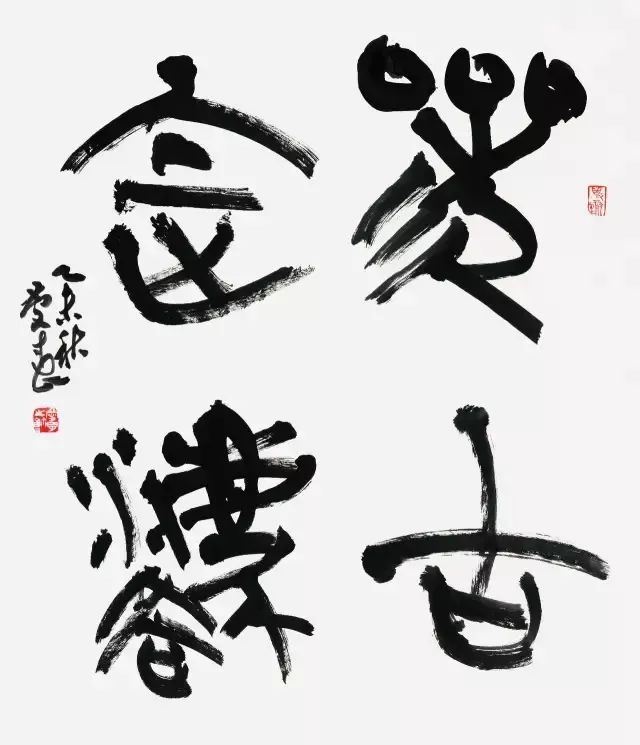 吴昌硕经年沉潜于诗书画印之中,陶冶性情,变化气质,可以把先秦古雅肃穆的《石鼓文》写的开张恣肆,不可一世,是基于他自身强大想象力的缘故??梢运担桓龃邮乱帐醮醋鞯娜?,假如在想象力方面有缺失,将注定其艺术生命不能久长。就书法创作而言,大多数作者很容易凝固在一条旧有的创作思路上。当我们打开一些书法展事的《作品集》,会发现某些老名家的最新作品与之十年前,乃至二十年前、三十年前的旧作相较,变化并不太大,凡读到此类作品大都会给予我们一种僵化陈旧的审美体验。造成这种情状的原因,大体是因为这类作者想象力的贫弱。20世纪90年代以来,大量的楚简、楚金文文字资料在两湖地区出土,最新的考古发掘报告,深刻影响着当代的篆书书法创作。20世纪末楚简文字的鲜活面世,其作用实在不亚于20世纪初,甲骨文、汉简牍出土对书法史的影响。如果说甲骨文、汉简牍的出土,一方面使我们清晰体察到吾国文字之祖甲骨文的完整面貌,另一方面我们又可以通过汉简牍墨迹的真面而窥得汉人用笔的精髓所在,不会再从汉碑剥蚀的刻划中去作“刻舟求?!笔降姆悍褐?,那么相较于甲骨文与汉简牍,楚简文字的出土则完全颠覆了我们既有的汉变秦法、隶变篆法的习常看法,事实上隶书用笔的提按变化,早在先秦之前已有成熟体例,大量楚简文字中所表现出的线条意识,是足以令我们感受到原来先秦书法还有另一面——生机勃勃的活力体现。当这么多的最新古文字考古成果展现在高庆春面前时,他敏感地意识到,个人书法艺术创变的契机到来了!高庆春在披览这些奇诡的楚简时,既惊异于上古书手的奇异想象力,此外这多奇诡的字形也在诱发着他内心深处所蕴含的高妙想象力勃发。自兹始,高庆春的书法创作显见又要迈向一个更高的境界了。