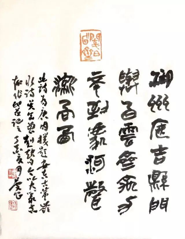 高庆春的篆书创作正是发轫于邓石如一脉的艺术表达型篆书创作体系,而尤对于这个学术谱系中的吴昌硕篆书会意独多。众所周知,吴昌硕以善学《石鼓文》书法享誉于世,但他笔下的《石鼓文》书法与作为秦篆先导的《石鼓文》书法原石却大相径庭,后者整饬妥帖,因完全异于六国文字而独称“籀文”,而吴氏笔下的《石鼓文》起笔粗重,线型葆有明显的顿挫笔意,至于在结体上更是左低右高,有意错落结字,不取原石字法的等匀。在我看来,吴昌硕取法《石鼓文》可归为是一种作为创作依据的临摹,这类临摹学古方式堪比“借题发挥”,正是借古人之“题”作个人的发挥?!澳氐闫魄镖ぺ?,苦铁画气不画形?!蔽獠段蘼圩骰魇榻允且运吮平阶晕倚刂兄槔?,因之“画气”与“写气”也正是吴昌硕艺术创作的灵魂所在。以高庆春早期的书法作品为观照,不难发现,吴昌硕《石鼓文》书风的影响对他是一种素丝初染式的浸洗,而且吴氏《石鼓文》书风的因子长期追随着他。高庆春在青年时代无论写小篆、汉篆乃至金文,都可以在古篆庄重典雅的线型中,融入一些活泼有趣的表现。笔毫时时在腕指之间翻转捻动,于不动声色的用笔动作中行笔速度自然就有了变化,故而线条的趣味也随之产生差异,庄重之外生出了灵异之气,恰似长江秋清,千里一道,冲飙激浪,瀚流不滞,个人所主的作书全以气魄夺人为胜,不在乎句栉字篦的审美理想最初成型矣。在这个时间段里,高庆春以金文长联为主体的书法创作频频入选国家级重要书法展事,同时他在金文书法创作方面的成果也滋养着他的篆刻创作,此际他的篆刻创作以三代古玺为尚,这恰是其金文书法创作的凝练表达。