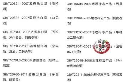 粮食酒的标准号不限于GB/T10781,还有其它地标级名牌产品、企业标准等,下面这张图片是琦哥收集到的白酒标准号,可以供朋友们收藏对照。