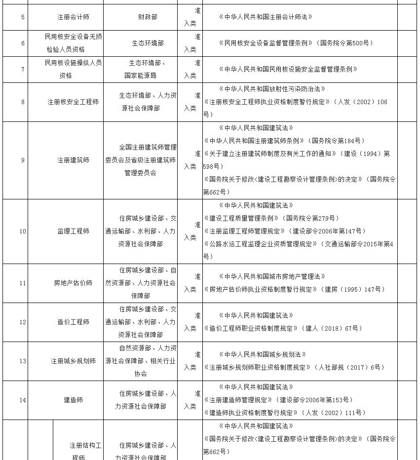 专业技术人员职业资格 目录(部分)