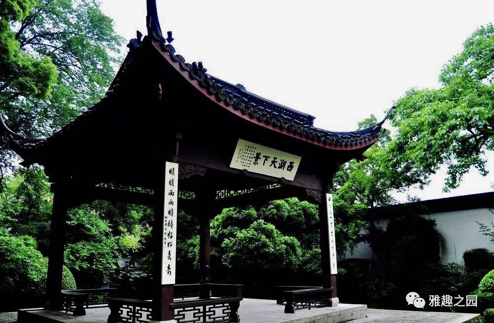 西湖天下景这副楹联,正是这两种美感的艺术表达。创作者黄文中,从“水水山山”的空间变化,到“晴晴雨雨”的时间变化,用一副楹联凝练丰富的情趣,以明快的叠词,明快的笔法,明快的书体,乃至匾联黑白相间的明快色调,将西湖的雅致与开阔的胸襟和盘托出,无不让人称绝。