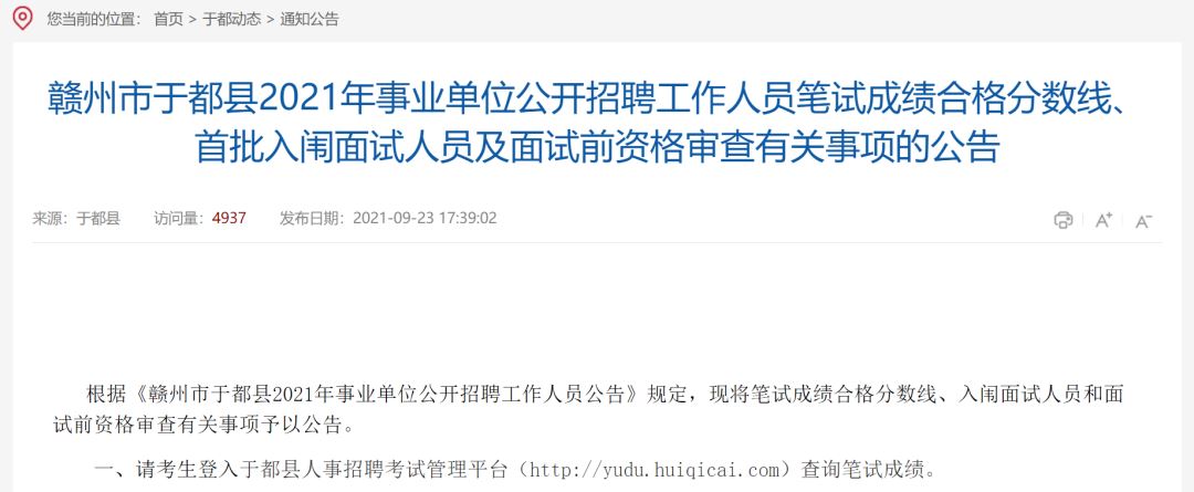 // 于都事业单位笔试成绩及首批入闱面试名单公布 //