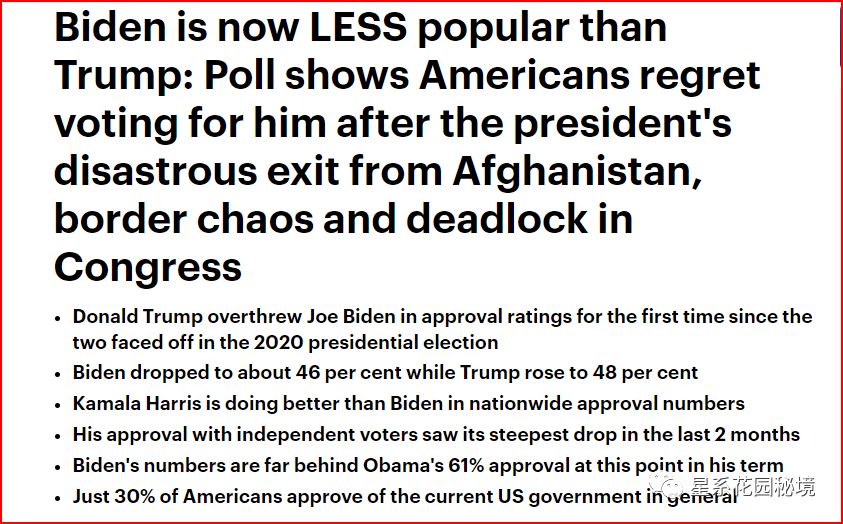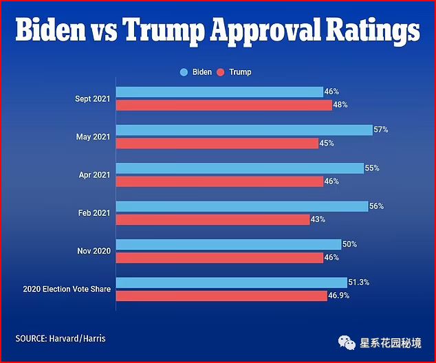 虽然,拜登由于在5月份骗大家说“新冠疫情已经被打败”而获得了57%的最高支持率,但在美军从阿富汗混乱撤离、南部边境?;约肮崴狡浠∩枋┓ò赶萑虢┚种?,民间对这位DS傀儡的支持率,大幅下降到9月份的46%(这还是其傀儡媒体做的调查,实际情况应该更低)。