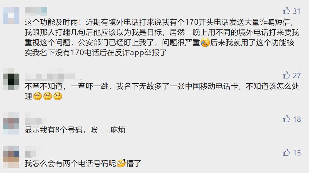 据了解,查询方式共有四种,比如在中国信通院官方网站,输入姓名、身份证号、手机号即可。其他查询入口还包括“工信微报”公众号、企业营业厅、工信部反诈专班、支付宝小程序“一证通查”。