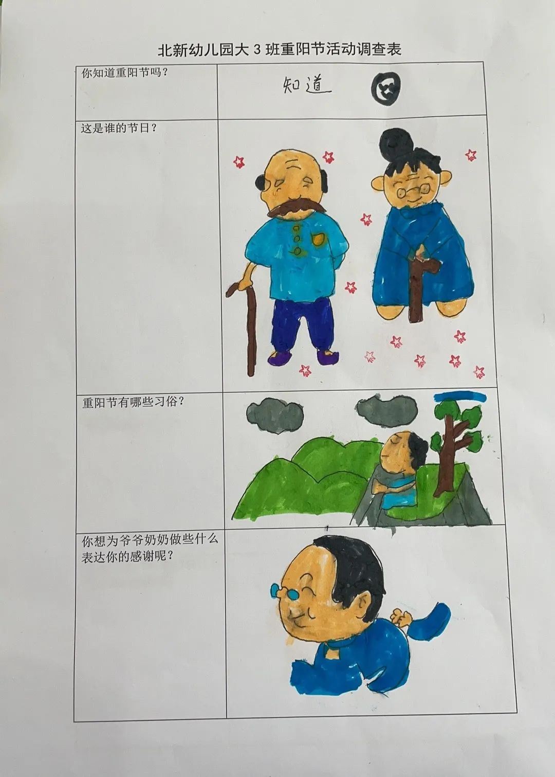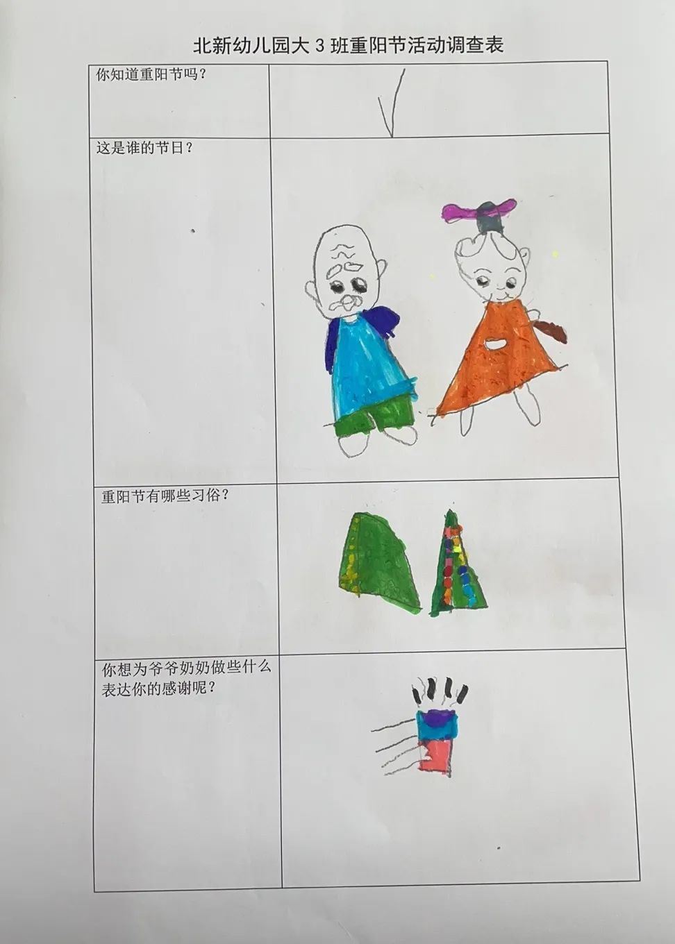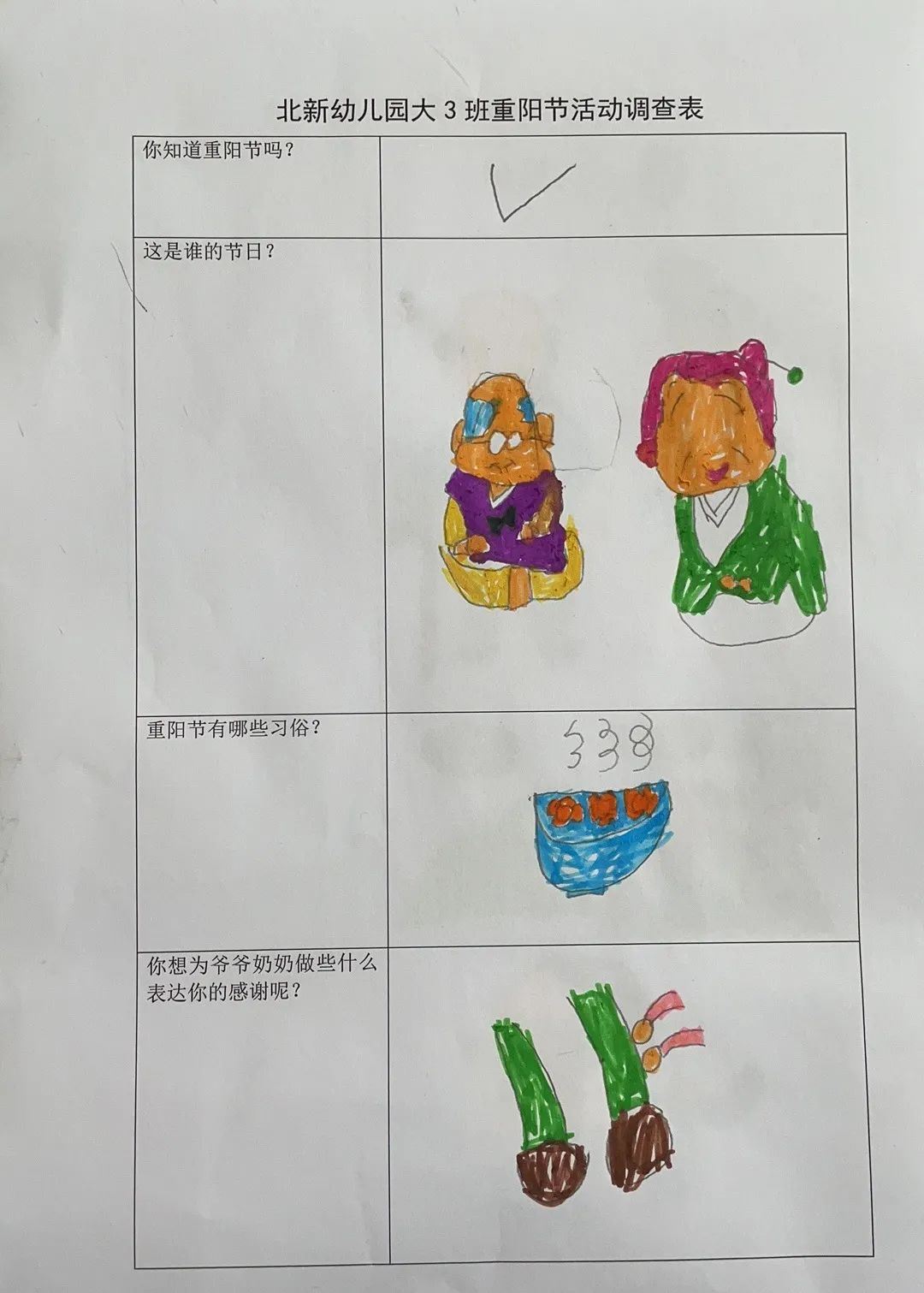 九九重阳节,我是小小调查员。大3班爱乘爱小朋友用稚嫩的笔触画下关于对重阳节的了解:重阳节是谁的节日呢?重阳节有哪些习俗?你想为爷爷奶奶外公外婆做些什么表达你的感谢呢?