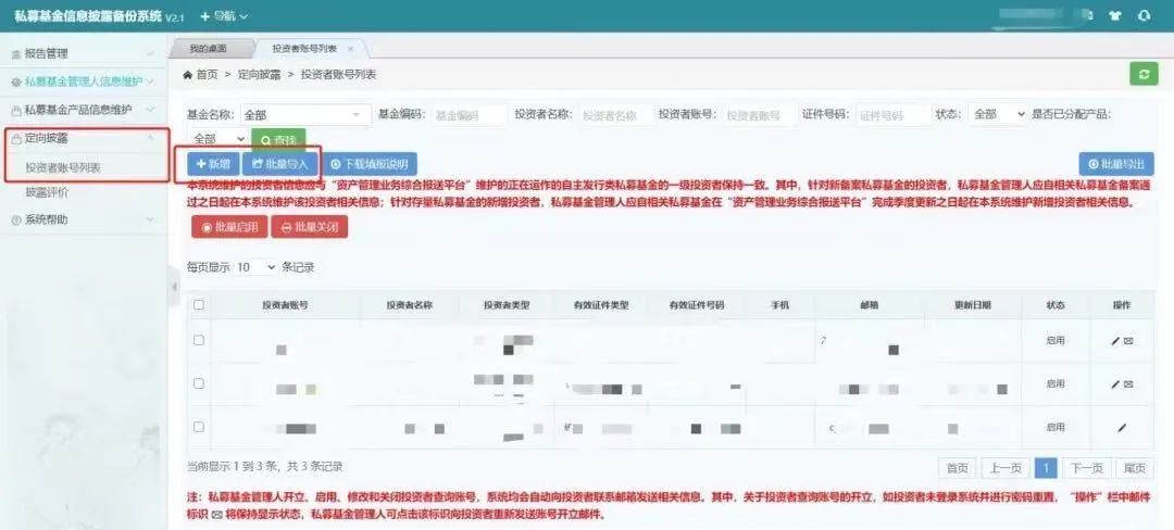 在协会信披备份系统(pfid.amac.org.cn),开通投资者查询账号有两种方式,手工录入及批量导入(开通路径:定向披露——投资者账号列表——通过“新增”手工录入或“批量导入”)。其中,批量导入需要按照协会的模板文件,增加客户信息。