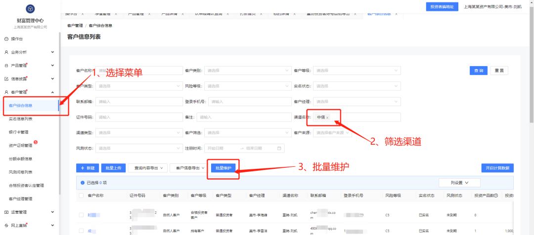 代销客户的邮箱,可以通过易私慕的客户管理功能来进行统一修改,修改后,即可利用上文提到的基协投资者查询账号一键导出功能,进行标准化导出,然后上传至协会系统批量开通。