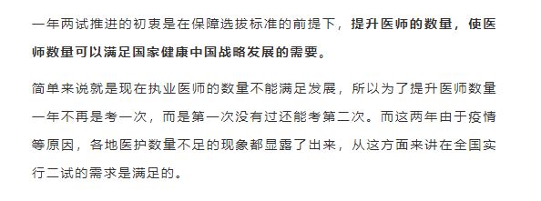 二试的专业依然是根据千人口医师的数量来选定的。为什么只有临床、中医两个专业?因为根据口腔、中西医、乡村全科医师的人数和基数以及社会的需求现自由自在完结文库阶段不需要开展二试,也就是说现有的数量可以满足国家健康中国战略发展的需要。但事实上这几个专业的缺口虽然比临床、中医好一点,但依然很大,所以未来根据社会需求及医师报考及通过的人数,政策走向会随时调整,口腔、中西医、乡村也会慢慢加入二试。