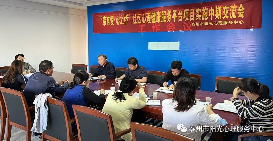今年泰州市阳光心理服务中心积极响应泰州市民政局“泰有爱?心之桥”社区心理服务平台建设要求,加入项目后,充分发挥专业特色,在各试点社区的大力支持下,扎实推进项目实施,取得了一定的成效。为总结前期工作情况及后续更好地开展服务,10月12日下午,阳光心理服务中心项目组在市民政局社会孵化中心四楼会议室举行了项目实施中期交流会,会议邀请了市民政局基层政权管理处杨波副处长,海陵熊良霄区民政局李松林副局长,高港区民政局侯金春科长,海陵区、高港区参与“泰有爱?心之桥”项目试点的鑫龙、梧桐、美好、春景、育才社区的书记和联络员,以及阳光心理服务中心项目组全体人员?;嵋橛裳艄庑睦矸裰行睦硎吕钊缙虢淌谥鞒帧;嵋橛腥鲆槌?。
