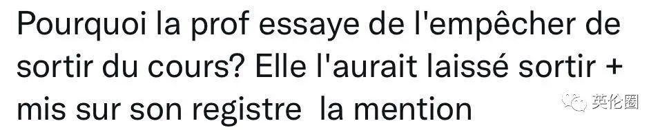 上周五(10月8日),就读于法国Jacques-Prévert职业学校的男学生Yassine与老师发生了争执,起因是他被阻止在课堂结束之前离开教室。女老师挡在门口试图和他讲道理,男生却猛地拉开了教室门。于是,老师重重地摔在了地上,在场的不少学生甚至发出了笑声。