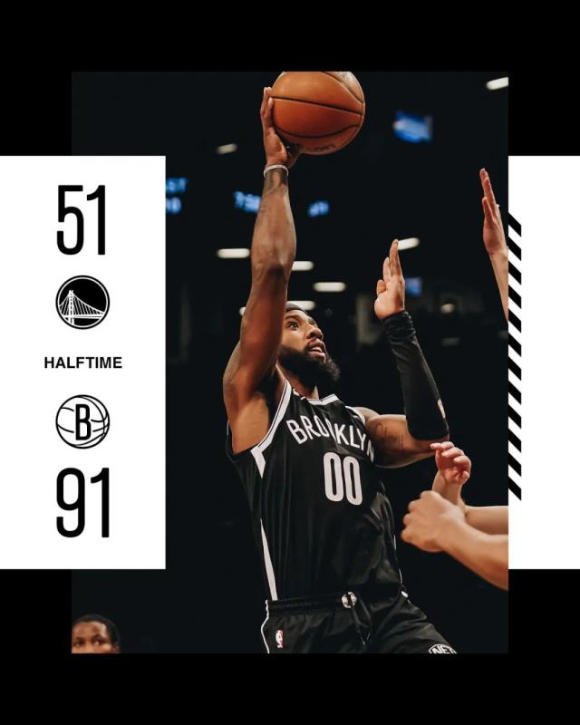 勇士的防守彻底被打穿了,第二节篮网进攻势头不减,单节再次轰下45分!你没看错,上半场篮网砍下91分!这是很多球队三节才能拿到的分数!91分是篮网队史半场得分纪录(此前86分),也是NBA历史半场第三高分。勇士沦为背景板!