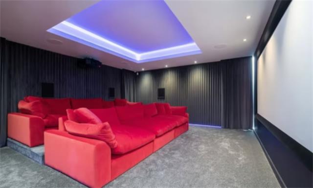 内部的豪华设施包括七间卧室、六个盥洗室、一个衣帽间、家庭影院、健身房、酒窖、会议室、桑拿房和休闲室。除室内车库外,露天车库还可停放四辆汽车。