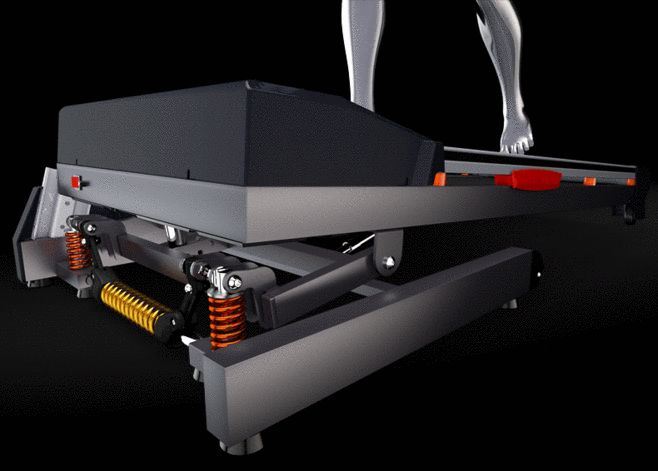 1. 弹簧减震:如上图所示,在跑板底部安装弹簧,吸收跑步中的冲击力,弹簧有纵向和横向安装法或者组合安装法,属于比较初级的减震系统。
