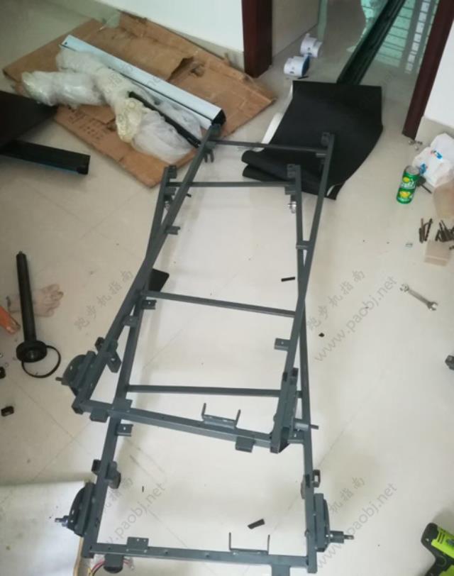 典型的平板跑步机,这样拆的很散了,应该可以看得很清楚,看看这个跑步机的整体支架是什么材料,再看看旁边瓷砖缝隙,如果瓷砖缝隙2毫米?那么该跑步机支架有几毫米粗?在对比下旁边的螺丝刀手柄,你还会购买吗?而且根本没有减震系统!