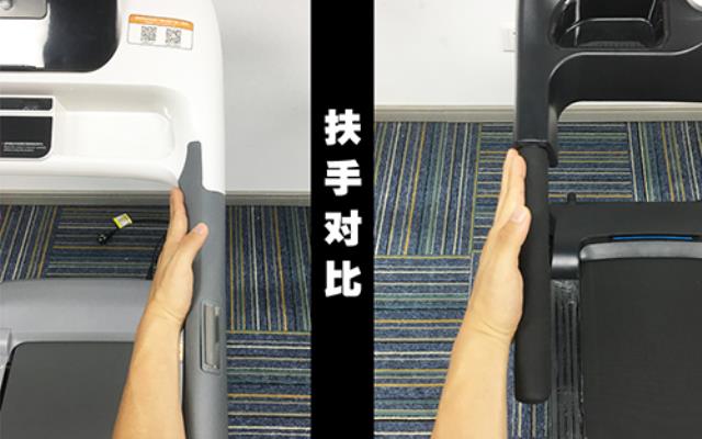对于跑步机来说,扶手的设计也能够看出跑步机厂商对于这一细节的用心程度。图中可以看出,千元机的扶手要比百元机要长出很多,宽度也略宽。较长的的扶手不仅能满足不同身高人群使用,而且也提升了跑步时的安全性。