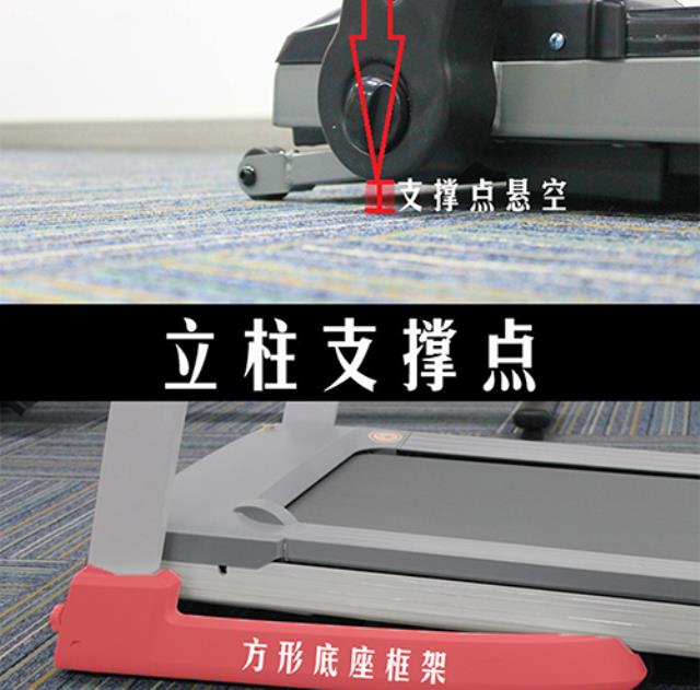 仔细探究一下原因,我们发现,立柱下方支撑点的设计,才是造成机身不稳定的重要原因。这台百元机的立柱下方与地面间有一段小小的距离,说白了就是悬空的,别看这点距离很小,但是很要命,立柱所受的从上至下的力,无法直接传导到地面,就会带动整个跑台侧翻,如果在上面跑步的人一旦重心不稳去扶扶手,整机侧翻的风险较大。