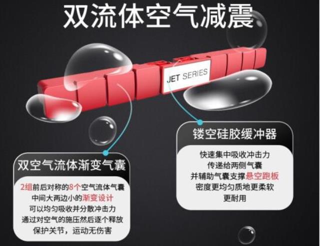 空气减震又叫气囊减震,就是用气囊作为减震材料。最早这种减震技术应用在跑鞋上,后来才被应用到跑步机上。和硅胶减震(橡胶减震) 相比,这种减震类型更好一点,但是支撑性没有硅胶减震实用。最终还是要看跑步机厂商的制作技术。常见代表有:锐步跑步机。