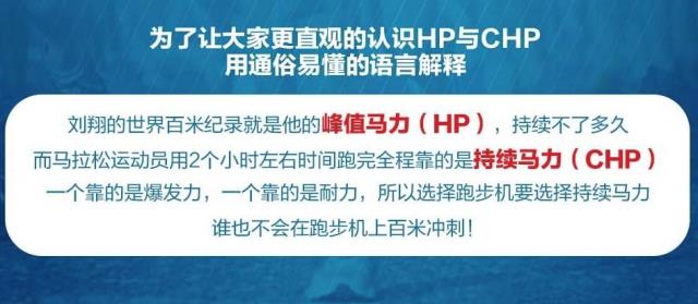 何为CHP(持续马力):持续马力=驱动力,只有跑步机马达马力够强,才能让你在跑步机上想怎么跑就怎么跑,要多快有多快,这也就是跑步机持续输出功率。