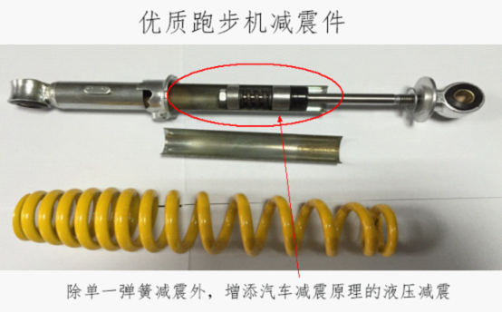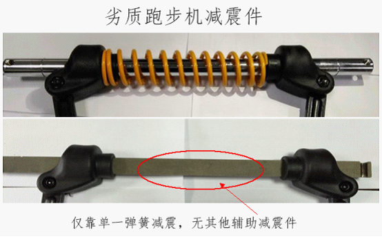 还有一种跑步机品牌,固然是搭配减震,但只是用几个弹簧横向纵向陈列凑数,无任何液压、气压帮助减震件。这种跑步机只是商家为了节俭成就 成见,用最简略的弹簧来忽悠花费者,让花费者误认为它能起到减震感化,现实应用中,减震感化甚小,噪音年夜问题依然存在。(如下图)