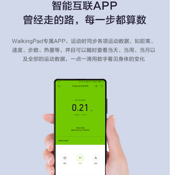 走步机采取 简洁充斥科技感设想作风,机身喷砂纹理覆面,镀铝装潢线条。采取 隐蔽式LED灯组,静置时浑然一体,活动时,各项活动数据会从面板下方透出浮现。支撑180°折叠收纳,收纳后面积仅0.44㎡,厚度仅12.9cm。