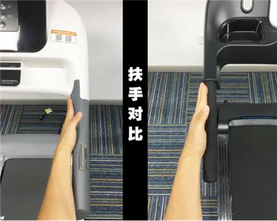第一眼直观感受到的就是图中的扶手对比,千元机的扶手要比百元机要长出很多,宽度也略宽。对于跑步机来说,较长的的扶手不仅能满足不同身高人群使用,而且也提升了跑步机在跑步的安全性,可以让你适合不同的跑步方式。