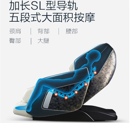 1精准按摩:SL型导轨贴合人体曲线。根据人体的S形曲线,制作L形按摩导轨,使其与人体脊柱深度贴合,按摩准确。3D按摩动作全方位立体按摩,感受3D立体深度揉捏,精确控制每种力量,腿部电动拉伸,适合不同高度,根据腿部类型和腿部长度自动调整按摩部位,随时享受私人定制的按摩体验。