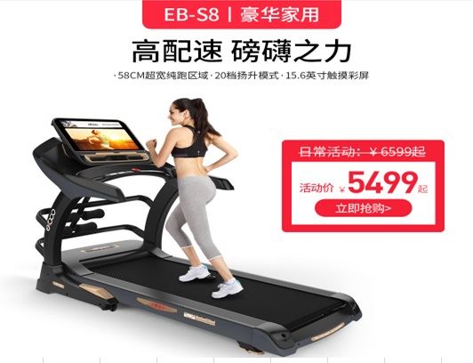 宜步A8:价格5949.00元,运行带面积139x54cm,跑步机净重97.7kg,连续输出功率2HP,峰值功率5HP,调速范围1-20km/h。