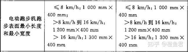 根据国家标准GB17498.6-2008规定,最高设计时速小于等于16km/h,跑带尺寸至少为120x40cm。最高设计时速大于16km/h,跑带尺寸至少为130x40cm。如下图: