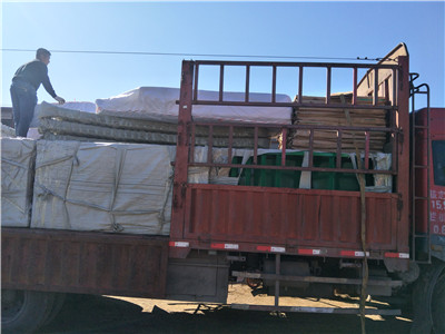 发往四川,的仿液压篮球架已经;装车完毕,液压篮球架带掩护套,现实师傅正在封车,一路安然