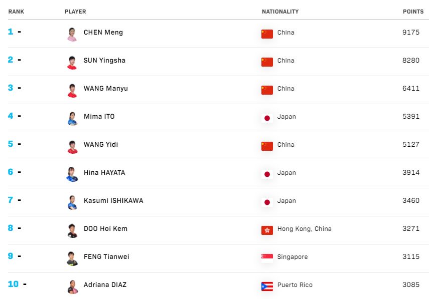 除上述选手外,国乒在10-20名阶段也有三位球员入围,世界冠军陈幸同排名第十五;国乒主力刘诗雯和久违赛场的朱雨玲,则依序排在第十七和第十八名。