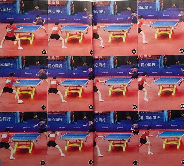 如如图7-10,樊振东跟着来球节奏进行步法调整,并在调整中随着来球落点使用身体重心向右微调找到精准的击球点,同时手臂也随球进行引手调节,完成小范围内的充分蓄力。梁靖崑的长虽然压迫性很强,但由乒乓球桌于受到樊振东侧上旋发球的限制,导致劈出的球旋转不强。樊振东准确判断到对方劈长的球性,及时把手拿高,调整动作方向。如图11-12,他通过手腕极小的卷拉动作进行调控,向左前方顶拉来球,压低出球弧线,同时他还使用左边腰胯前顶配合发力,增强回球的压迫性,展现了极强的爆发力。这板球完成了从下旋到上旋的过渡转換,把双方带入了“拼刺刀的环节。