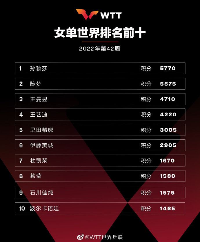 女单前十同样无更改,中国队球员孙颖莎、陈梦、王曼昱和王艺迪位列前四。