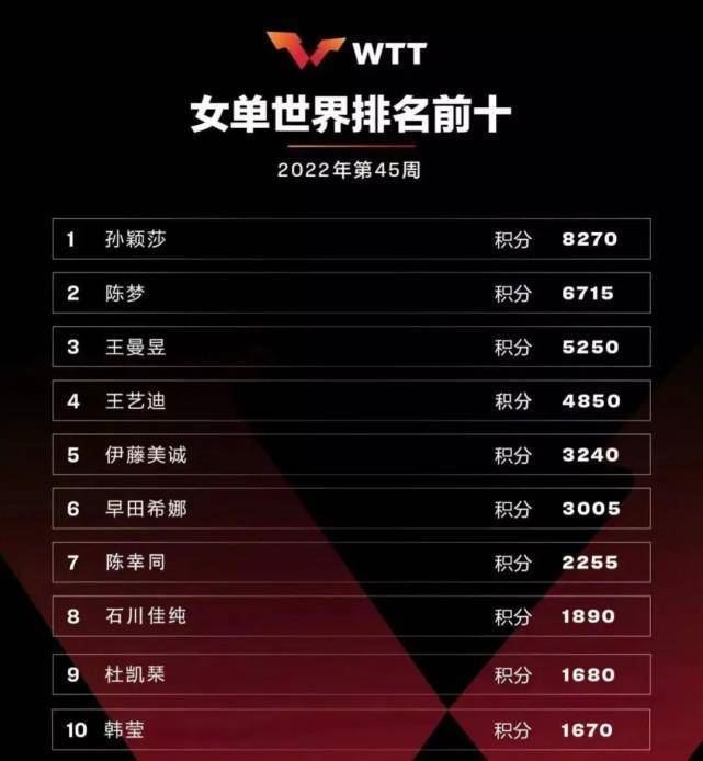 值得注意的是,根据近期国际乒联女子积分榜,王曼昱目前以5250分位列第三,王艺迪以4850分位列第四。