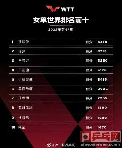今天国际乒联公布了2022年第运动人生xuejiazl.org47周最新排名运动人生www.wgqpnmx.cn,男单樊振东依然以7700分位列世界第一,而张本智和超过马龙、王楚钦,升至第二。女单前10名暂时不变。男单前13:1.樊振东 77002.张本智和 45503.马龙 44004.王楚钦 43455.莫雷高德 33456.梁靖崑 2985