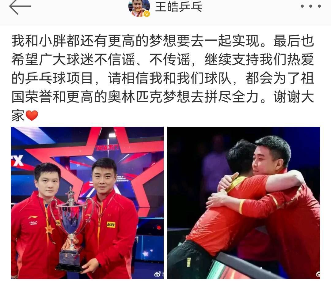 王皓说过,他会一直陪着小胖,他们还有更高的目标需要一起去实现。这个目标就是帮助樊振东站上奥运会男单最高领奖台,让樊振东实现大满贯。王皓为小胖,也是为了自己。