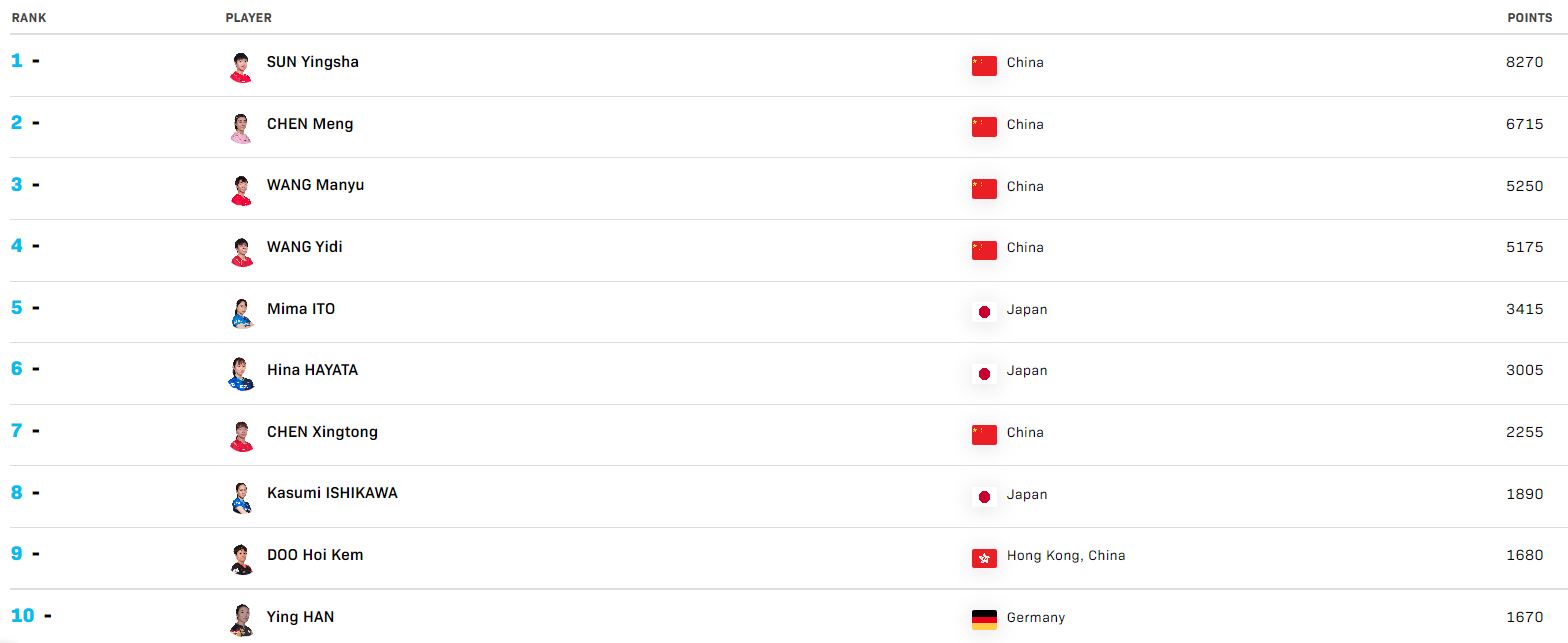 世界排名丨樊振东孙颖莎领跑单打排行榜 女单前十国乒占