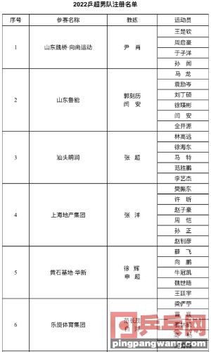 本届乒超联赛中,男团共有9支队伍入围,女团则有6支球队。从阵容来看,以刚刚在黄石全锦赛上拿下男团冠军的上海队成员为主要班底的上海地产集团俱乐部阵容强大,阵中除两位奥运冠军樊振东和许昕外,还有赵子豪、周恺等一众中生代球员加盟。全满贯得主马龙依旧效力于山东鲁能俱乐部,近来上升势头迅猛的新生代主力王楚钦本赛季在山东魏桥·向尚运动担纲主力,另一名国乒左手名将林高远将代表汕头明润出战本赛季乒超。2022乒超男队完整注册名单如图2女队方运动人生xuejiazl.org面,深圳大学和山东鲁能两队阵容都相当强大。前者不仅坐拥东京奥运会双冠王陈梦,近期接连拿下WTT澳门冠军赛、世界杯总决赛单打冠军的孙颖莎也在阵中。加上颗粒打法的何卓佳、小将纵歌曼等人,深圳大学实力不言自喻。