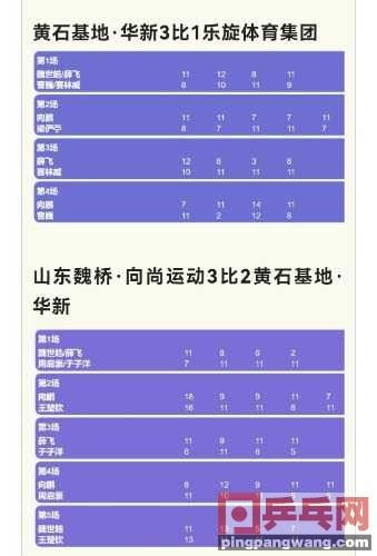 卫冕冠军山东魏桥·向尚运动则打满了五盘才涉险过关,他们的对手是拥有向鹏、薛飞和魏世皓的黄石基地·华新。今天上午场比赛,黄石基地·华新3比1战胜了乐旋体育集团,状态非常不错。对阵卫冕冠军,黄石基地·华新首盘由魏世皓/薛飞出战,不过面对周启豪/于子洋,他们虽然发挥出了较高水平,但是仍1比3落败,紧接着向鹏苦战5局不敌王楚钦,黄石基地·华新0比2落后。第三盘,薛飞3比1战胜于子洋为球队挽回一线生机,第四盘向鹏再度上阵,又是五局大战,这一次向鹏笑到了最后,他在1比2落后的局面下逆转周启豪,帮助球队把大比分追平。第五盘,王楚钦再度上阵,面对之前全锦赛上曾输过的魏世皓,他没有重蹈覆辙,3比1锁定最终胜利。